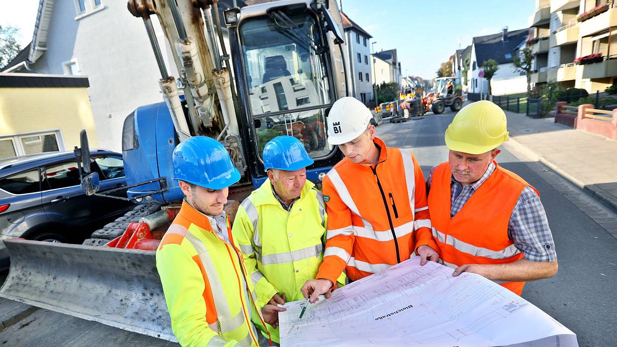 Haben den Helm auf: (v. r.) Bauleiter Klaus Schultz, Bauleiter Alexander Garen, Polier Klaus Steinweg und Mitarbeiter Maurice de Santis studieren die Pläne für die Sanierung des Kanalisationssystems an der Startstelle Bleichstraße Ecke Feldstraße. | © Sarah Jonek
