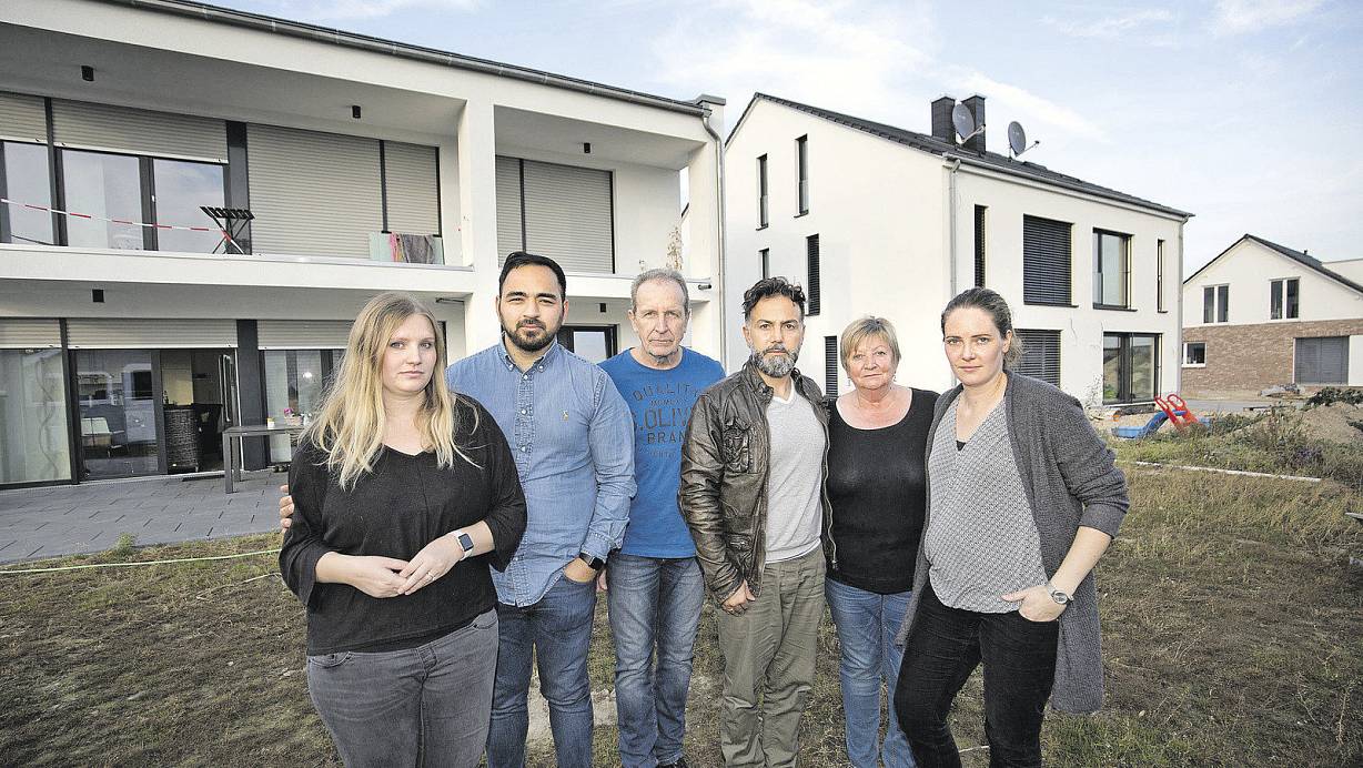 Sind sehr verärgert: Die Hauskäufer Lena Kuhlmann, David Sarkisjan, Max Dreger, Bülent Sahin, Monika Dreger und Charlotte Sahin stehen im Garten ihrer Häuser an der Straße Lütkemeiershof in Babenhausen. Der Immobilienerwerb hat den vier Parteien bisher einen Dauerstreit mit dem Bauträger eingebracht. | © Oliver Krato