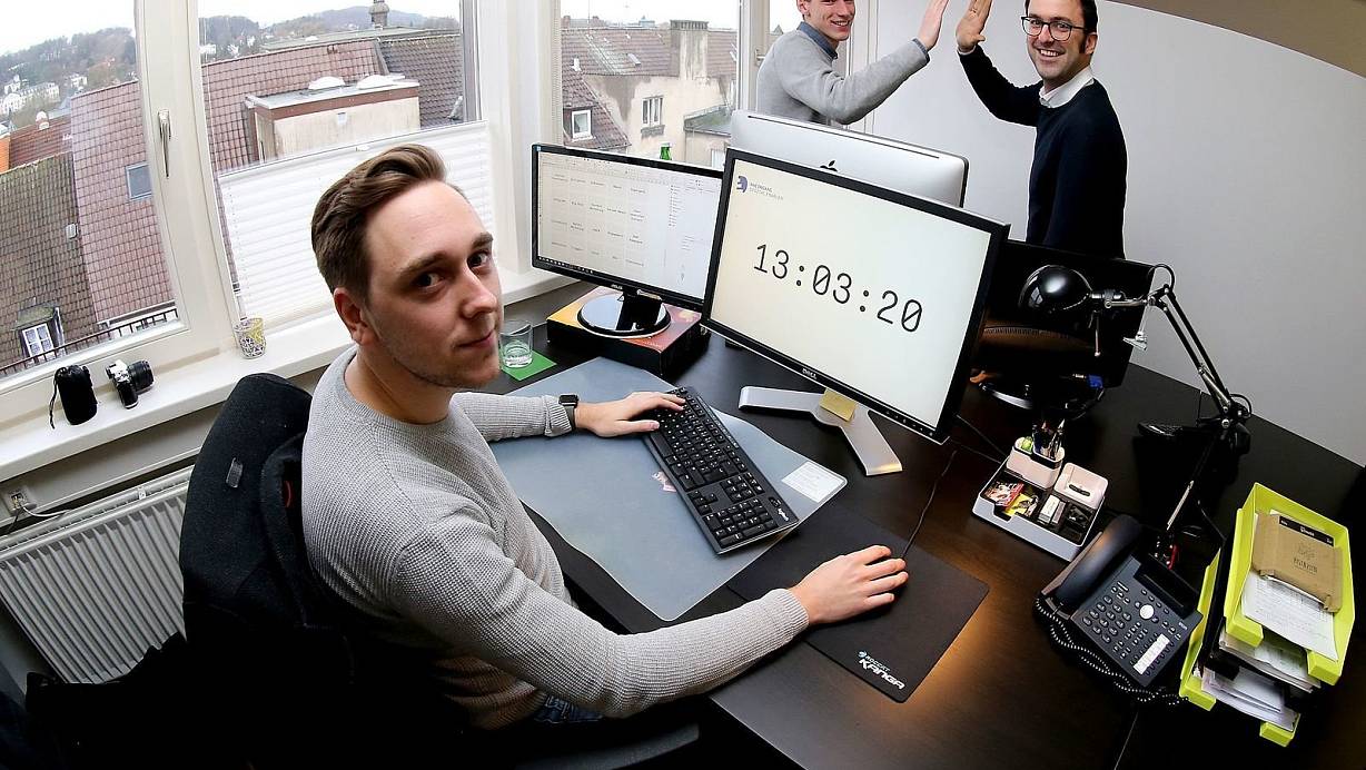 13 Uhr Feierabend: Mark Mühlberger kann gleich den Rechner ausmachen, während vor seinem Schreibtisch Kollege Mario Klassen bereits von Chef Lasse Rheingans (r.) verabschiedet wird. Rheingans hat den Fünf-Stunden-Tag eingeführt. | © Wolfgang Rudolf