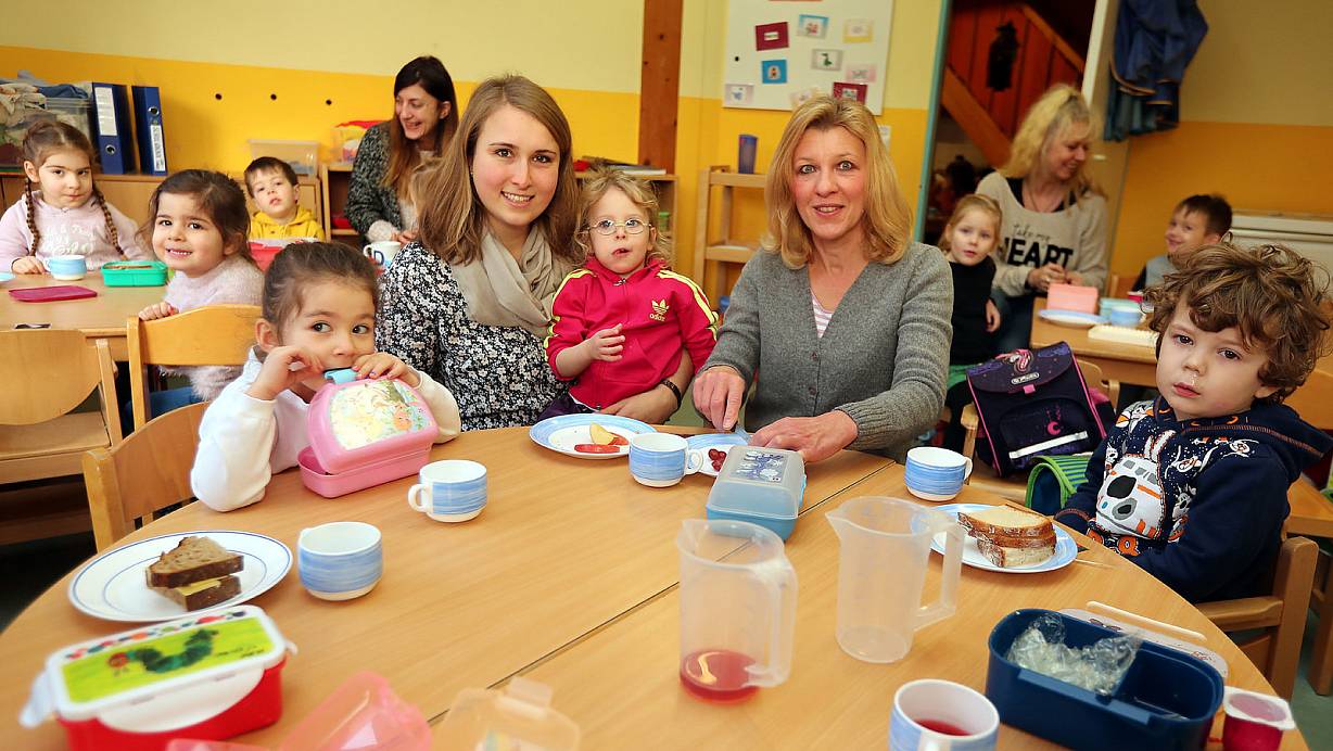 Kurze Pause: Kerstin Winter (53, vorne rechts) schneidet beim gemeinsamen Frühstück Weintrauben für ihre Schützlinge klein. Damit Aytül (3), Melia (3), Frederick (3, v. l.) und die anderen Kinder danach gestärkt zum Ausflug starten können. Katharina Oberschachtsiek (vorne l.) leitet die Kita „Zehlendorfer Damm". | © Wolfgang Rudolf