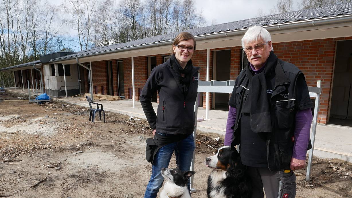 Das Gebäude steht: Tierheimleiterin Anna Venzke mit ihrem Border Collie Fergus und Tierschutzverein-Vorsitzender Helmut Tiekötter mit seinem Berner Sennenhund Ayla vor dem neuen Hundehaus. Bis zum Juli sollen die Arbeiten im Haus und für den Auslauf fertig sein. | © Kristoffer Fillies