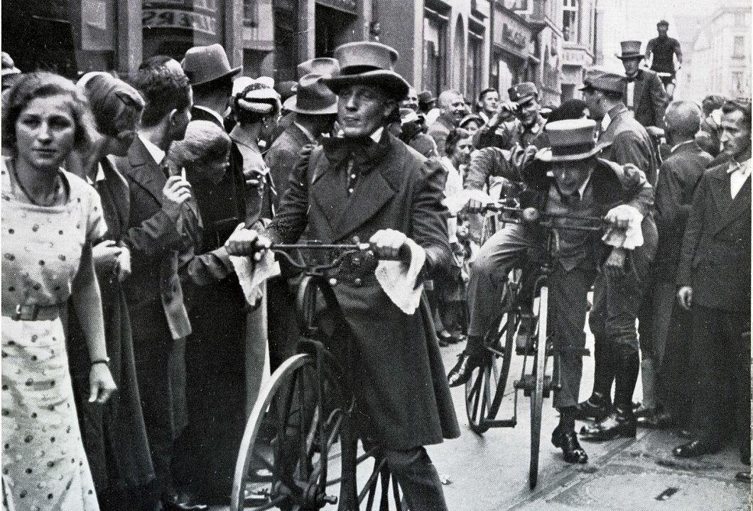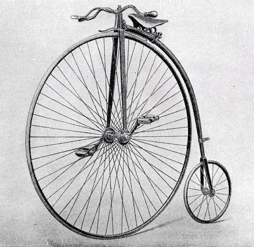 Dem Velociped folgt als nächste technische Erneuerung - das Hochrad: Um eine bessere Kraftübersetzung zu ermöglichen, wird das Vorderrad wesentlich höher gebaut als das Hinterrad. Letzteres dient nur noch als Stützpunkt und wird infolgedessen stark verkleinert. Von den Hochrädern gibt es jedoch nur wenige in Bielefeld bei wohlhabenden Liebhabern des neuen Hobby. Im Unterschied zum „Velociped" haben sie bereits eine Luftbereifung.