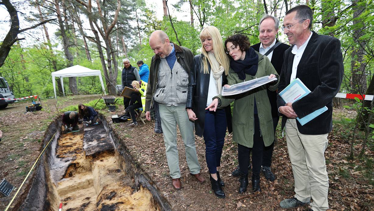 Freudige Archäologen: Entdecker Renè Jansen Venneboer (v.l.), Barbara Rüschoff-Parzinger, Bettina Tremmel, Sven Spiong und Michael Rind vom Landschaftsverband Westfalen-Lippe. | © Sarah Jonek