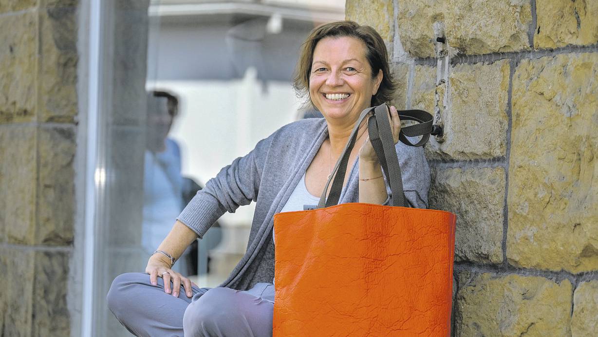 Die ersten Unikate sind fertig: Katja Führmann mit einer großen Tasche aus Ananas-Leder in Rot vor ihrem Laden. | © Andreas Zobe/NW