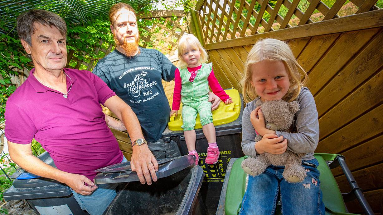 Sollen jetzt eine größere Tonne bekommen: Hilmar Fiebig mit Sohn Gerrit Fiebig und den Enkeltöchtern Feyja (2) und Mina (5, v. l.). Auch Teddy Paul darf mit aufs Bild. | © Mike-Dennis Müller / www.mdm.photo