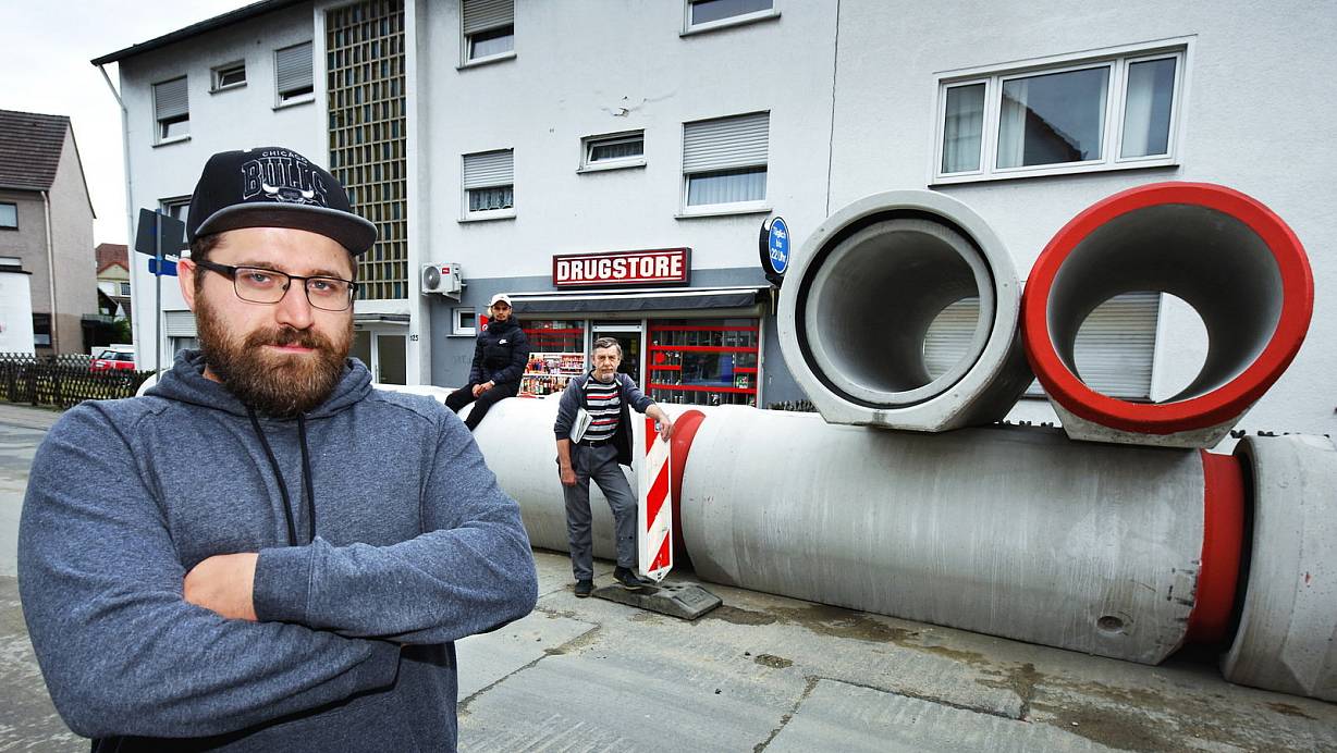 Warum direkt vor meinem Geschäft?: fragt Murat Cam (l.). Sein Drugstore an der Bleichstraße 135 geht hinter Betonrohren, die für Kanalbauarbeiten angeliefert wurden, unter. Mitarbeiter Okan Türkan und Anwohner Peter Dlugosch (r.) sind entrüstet. | © Barbara Franke