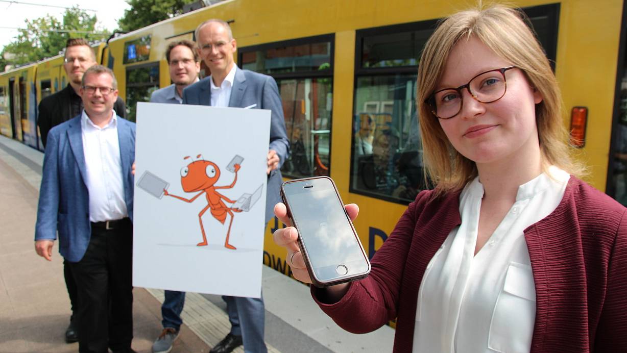 Freuen sich gemeinsam mit "Alex Ameise" (Poster) über die Infantilisierung des Nahverkehrs: Stefanie Sasse (v. r.), Martin Uekmann, Timo Prünte (alle MoBiel), sowie Martin Löhdefink und Julian König . | © Ingo Kalischek