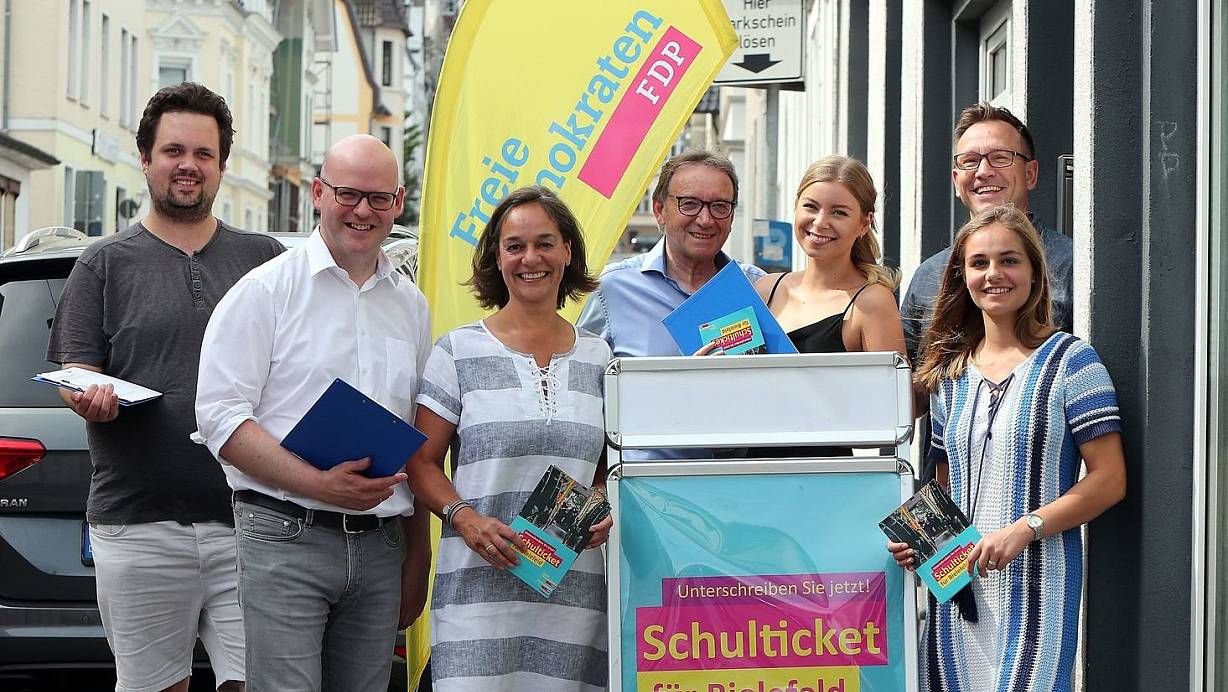 Sammeln Unterschriften fürs Schulticket: Die Bielefelder FDP um Nicolas Strahlke, Jan Maik Schlifter, Jasmin Wahl-Schwentker, Jürgen Weber, Samira Classen, Kai Detlefsen und Jamila Wahl-Schwentker (v. l.) vor der Geschäftsstelle. | © Wolfgang Rudolf