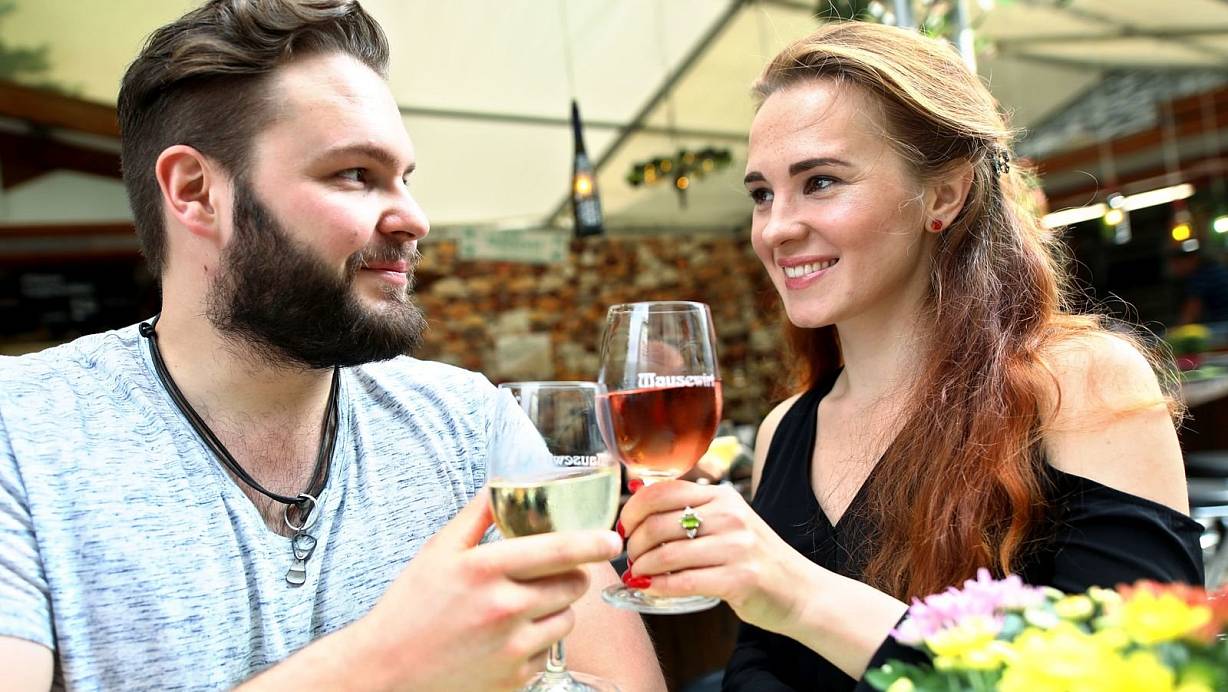 Sebastian Ziemann und Julia Hauptmann auf dem Bielefelder Weinmarkt - am Dienstag, 3. September, geht's wieder los mit Federweißer, Flammkuchen und mehr. | © Sarah Jonek