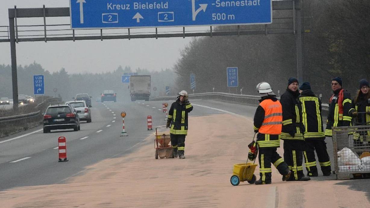 Die Feuerwehr ist mit großen Einheiten auf der Autobahn 2 am Bielefelder Berg im Einsatz, um ausgelaufenes Öl aufzufangen. | © Symbolfoto: Andreas Eickhoff
