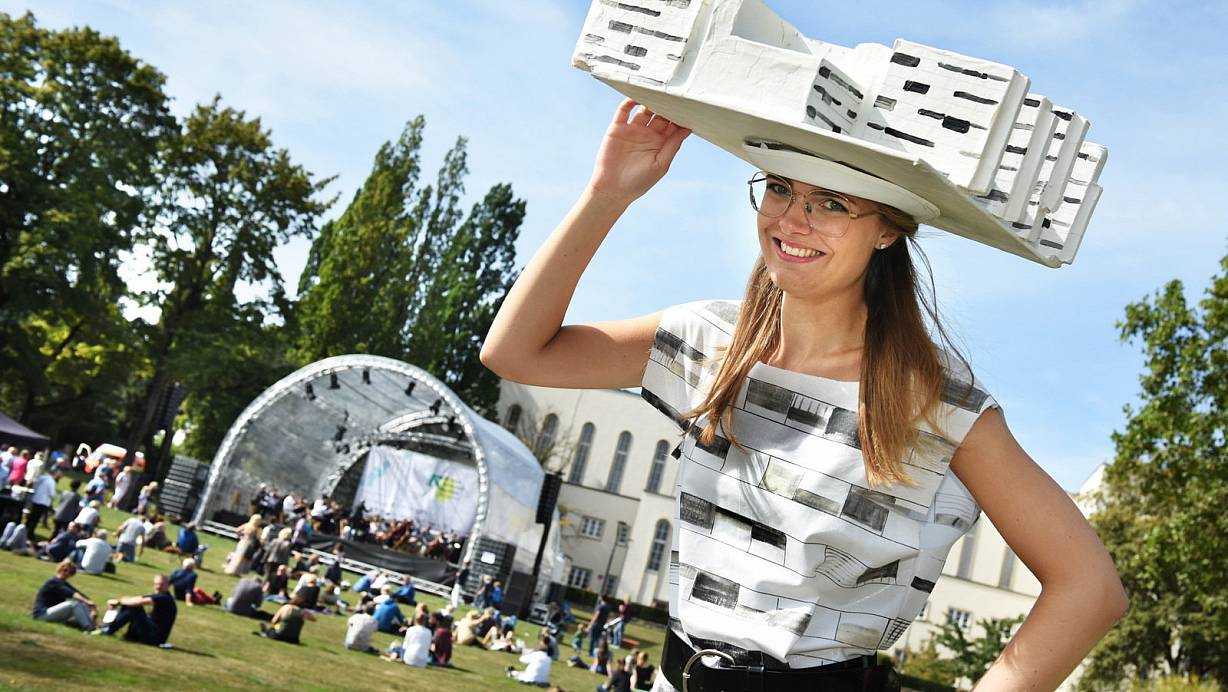 Rabea Heller genießt als Uni Bielefeld die besondere Feststimmung im Bürgerpark. Ihr Auftritt ist sinnbildlich zu verstehen. Am Sonntag kamen 200 Wissenschaftler mit ihren eigens erdachten Aktionen zu den Bielefeldern in die Stadt. | © Barbara Franke