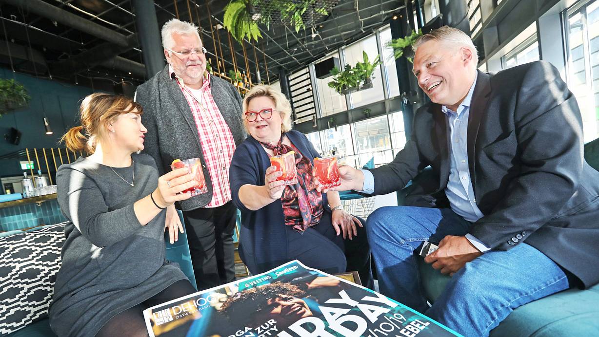 Montag ist Partytag: Irina Wiebe (Max Raebel, l.), Dehoga-Präsident Andreas Büscher und Detlef Rübenach sind schon jetzt in bester Stimmung. | © Sarah Jonek