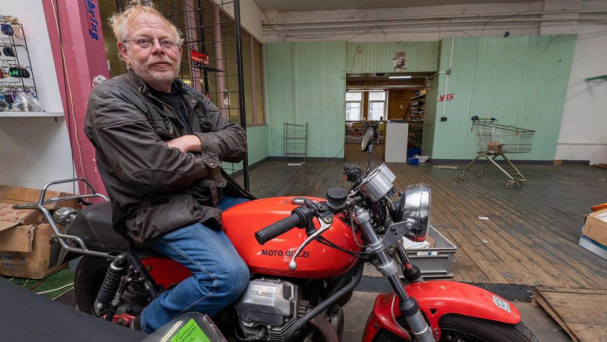 Wehmut: Mathias Dürbusch muss unerwartet sein Motorradgeschäft in Brackwede aufgeben. Heute ist der letzte Tag, die Halle ist schon fast leer. Mit seiner roten Moto Guzzi fährt der 61-Jährige, mit der Ehefrau im Beiwagen, gerne nach Italien. | © Dennis Angenendt