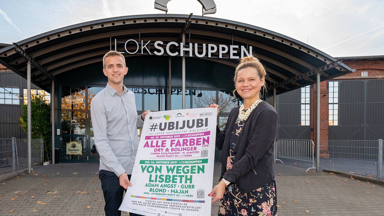 Zwei Tage Party: Projektleiterin Maren Diebels von der Uni Bielefeld und Eventmanager Marius Wiegard laden zum Indoor-Festival im Bielefelder Lokschuppen ein. | © DENNIS ANGENENDT - 2019