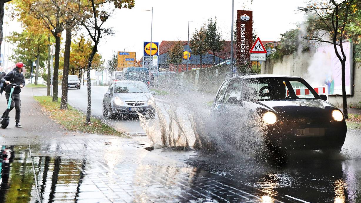 Unter der Bahnunterführung am Ringlokschuppen sammelt sich bei Regen viel Wasser, das im Gulli nicht abfließt. Autos sorgen für große Spritzer