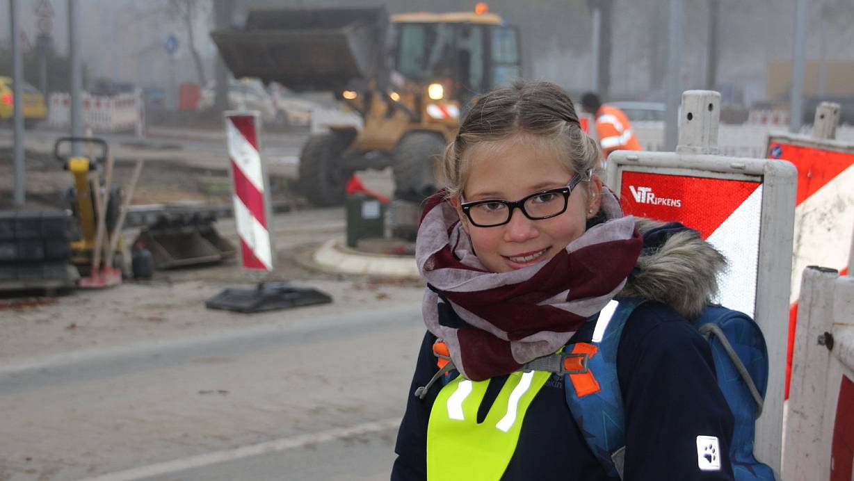 Lächelt tapfer: Viertklässlerin Caitlyn (9) weiß nicht, wie sie die Kreuzung Oelmühlenstraße/ Teutoburger Straße überqueren soll, um zur Diesterwegschule zu kommen. Auch ändert sich an der Verkehrsführung rund um die Großbaustelle ständig etwas. | © Ivonne Michel