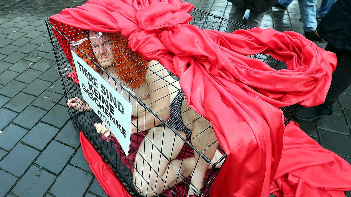 Jens Vogt macht in einem Käfig in der Bielefelder Fußgängerzone auf das Leid der Tiere aufmerksam | © Wolfgang Rudolf