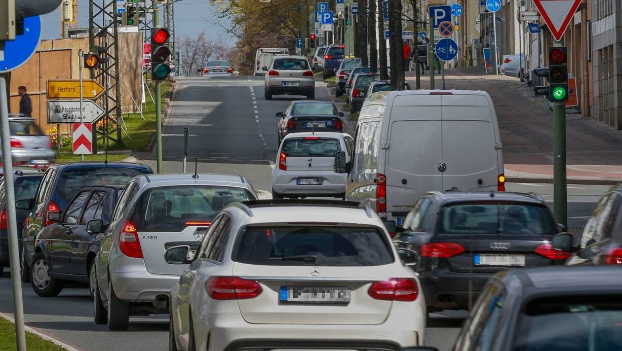 12 Uhr: Zu massiven Verkehrsproblemen kommt es derzeit auf der Herforder Straße in Höhe der Zimmerstraße: Es gibt am Parkhaus des Shoppingcenters Loom einen langen Rückstau.