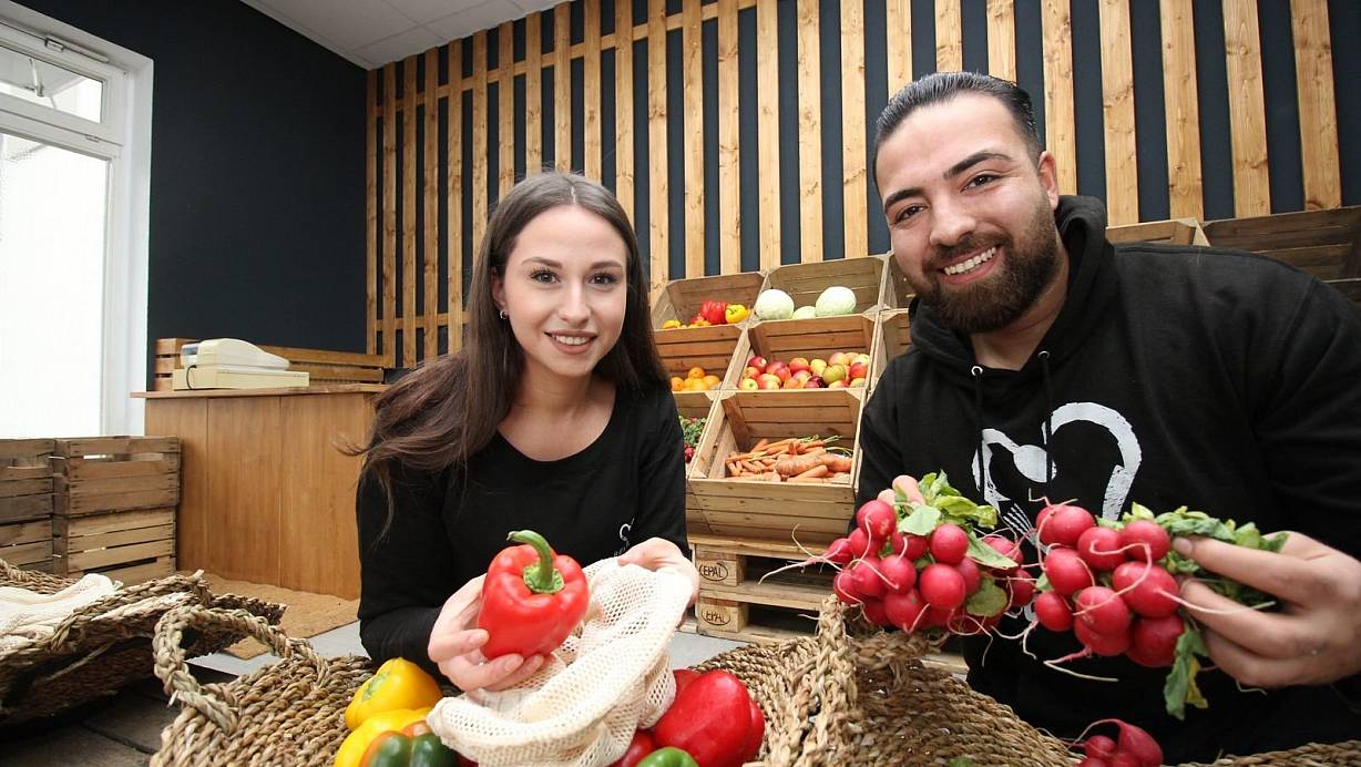 Mustafa und Elif Budumlu bieten ab Donnerstag Obst und Gemüse im „Rettermarkt“ an. Sie haben den gemeinnützigen Verein „Restlos“ gegründet. In einem Zelt vor dem Laden soll auch gekocht werden.