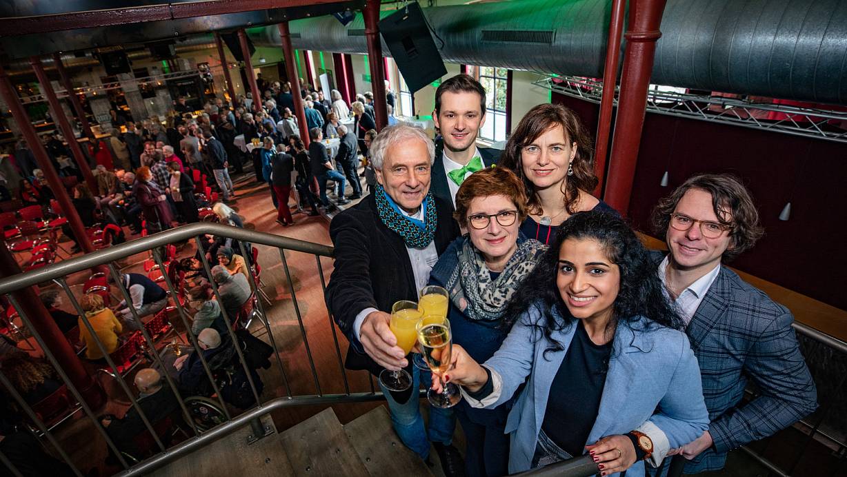 Jens Julkowski-Keppler, Dominic Hallau, Britta Haßelmann, Alexandra Geese, Schahina Gambir und Matthi Bolte-Richter (v.l.) beim Neujahrstreffen der Bielefelder Grünen in der Hechelei. | © Mike-Dennis Müller