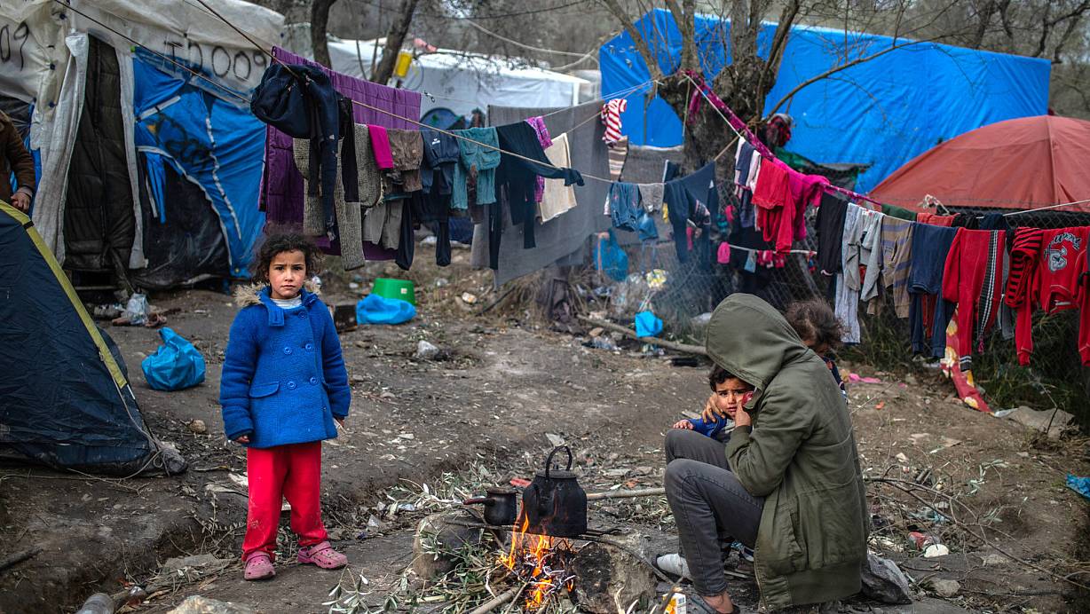 Eine Migrantenfamilie versucht, sich an einem kleinen Feuer in einem provisorischen Lager neben dem Lager in Moria aus Lesbos zu wärmen. | © picture alliance/dpa
