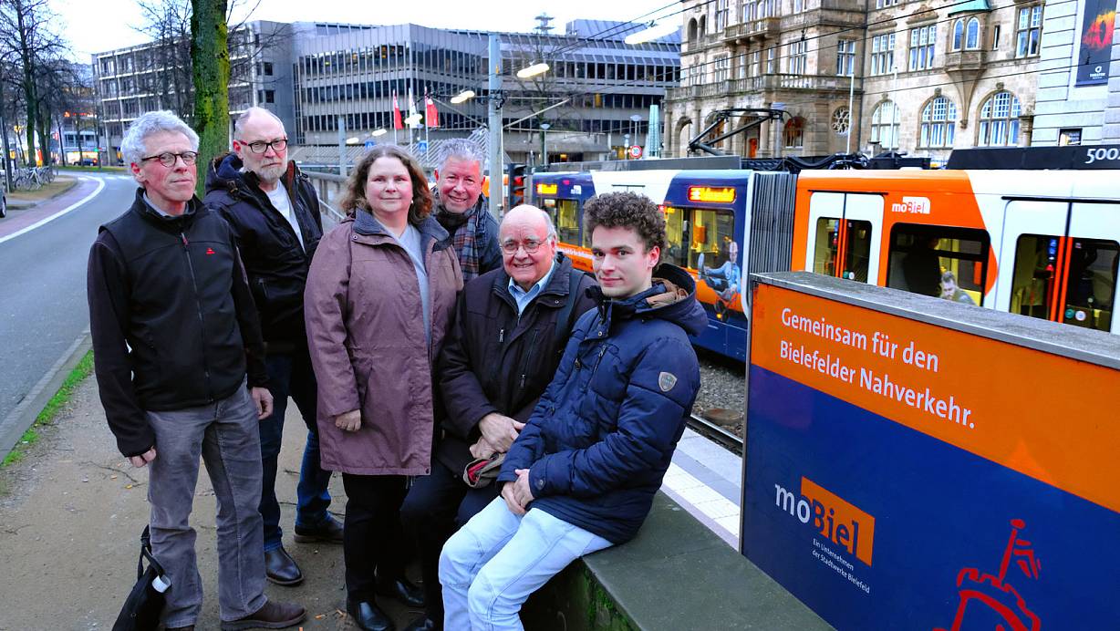 Mut zur Verkehrswende fordern Roland Tillmann (Radentscheid, v.l.), Hermann Janßen (Verdi OWL), Katja Häckel (Bielefelder Jugendring), Norbert Müller (ehemaliger Geschäftsführer der BGW), Godehard Franzen (Pro Nahverkehr) und Benjamin Angermann (Fridays for future). |