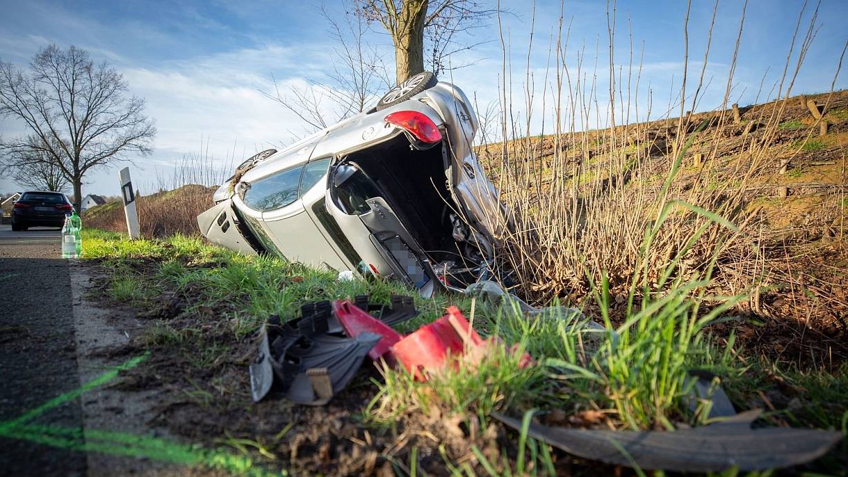 Der Peugeot hat sich nach dem Aufprall überschlagen und ist im Straßengraben an einem Baum gelandet. | © Mike-Dennis Müller / www.mdm.photo