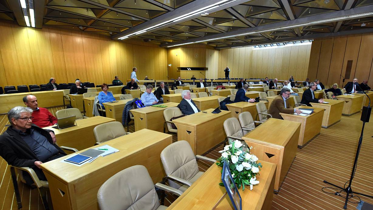 Viele Plätze blieben im Ratssaal leer: Für die verstorbene Barbara Schmidt stand ein Gesteck auf dem leeren Platz. Die anwesenden Ratsmitglieder verteilten sich so, dass sie möglichst zwei Meter Abstand hatten. Für ihre abwesenden Kollegen stimmten sie mit. Foto: Barbara Franke | © Barbara Franke