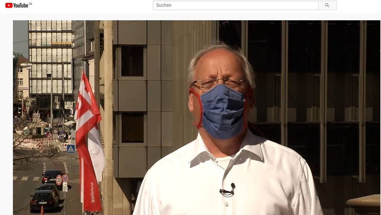 Mit Mundschutz trat Bielefelds Stadtoberhaupt jetzt vor die Kameras. Er geht nicht davon aus, dass der Corona-Ausnahmezustand zeitnah endet.