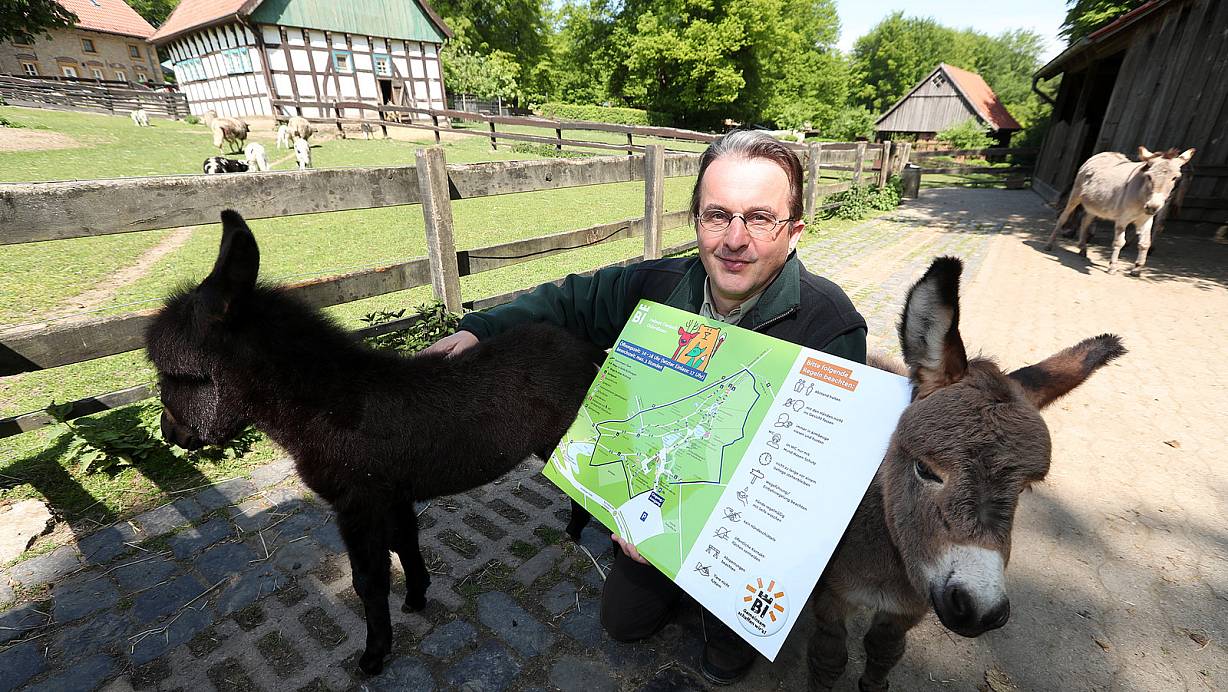 Tierparkleiter Herbert Linnemann präsentiert das Hinweisschild, das die Besucher auch als Infoflyer am Eingang bekommen. Die neugierigen Zwergesel-Fohlen Johanna (links, am 10. April geboren) und Liesel (geboren am 26. April) wollten auch mit aufs Bild. | © Wolfgang Rudolf