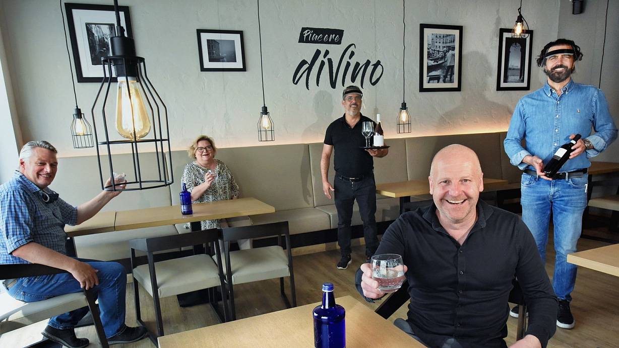 Vor dem Start: Detlef Rübenach, Regine Tönsing (beide DEHOGA), Mario Mungianou (Piacere Divino), Henner Zimmat (Kaufmannschaft) und Gianni Mete (Piacere Divino, v. l.). | © Barbara Franke
