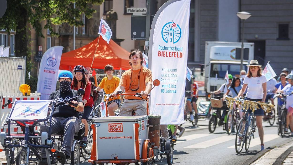 Bei einer 24-Stunden-Demo radelten über 100 Menschen um das Bielefelder Rathaus – nicht alle gleichzeitig, aber rund um die Uhr.