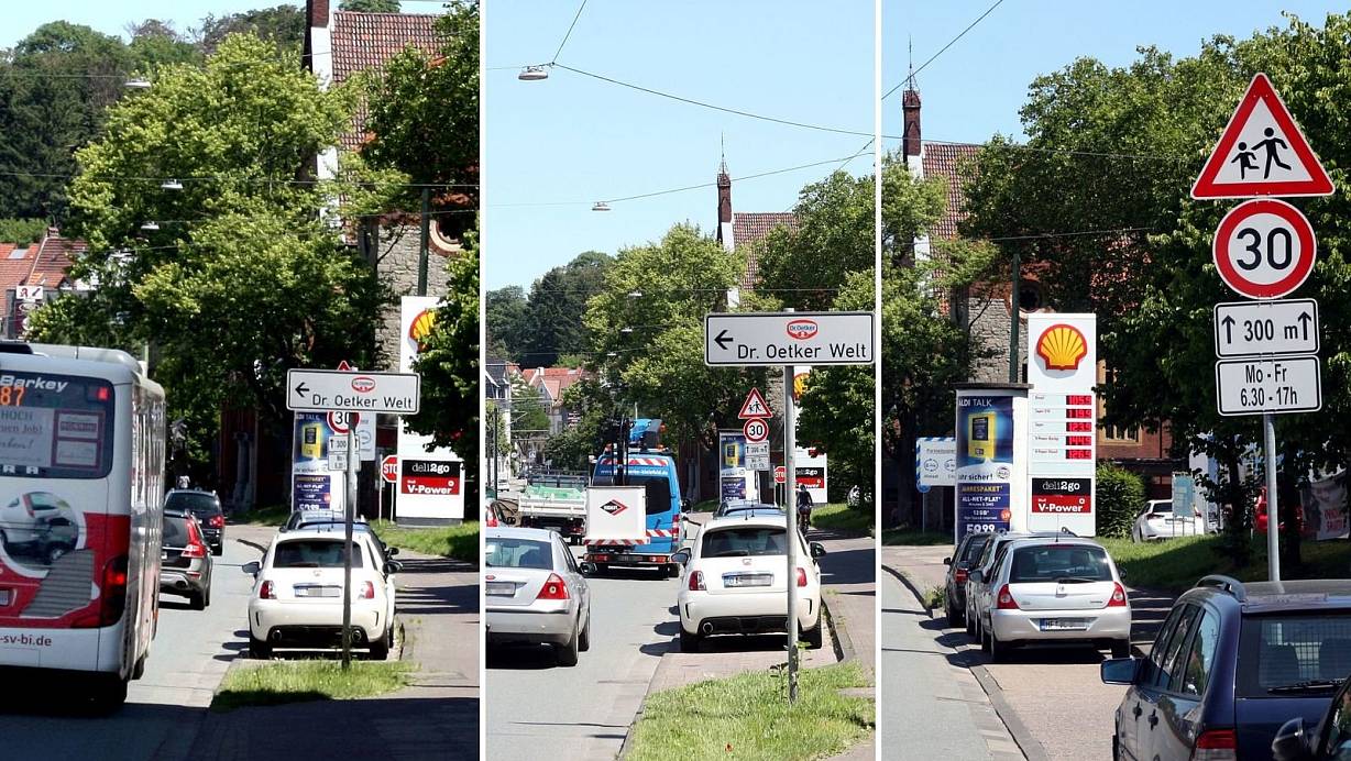 Vom Quellenhofweg aus (noch 120 Meter bis zur 30er-Zone) ist das Tempolimit vom Oetker-Hinweis verdeckt (l.). Das ändert sich etwa 40 Meter später (Mitte). Nun taucht das Schild drunter auf. Beim Passieren ist es dann einwandfrei erkennbar (r.). | © Jens Reichenbach