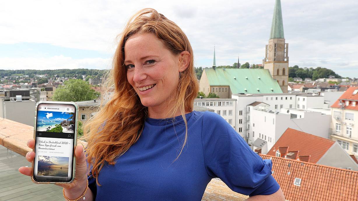 Reisebloggerin Rebecca Schirge zeigt ihren Blog - im Hintergrund ist Bielefeld zu sehen. | © Wolfgang Rudolf