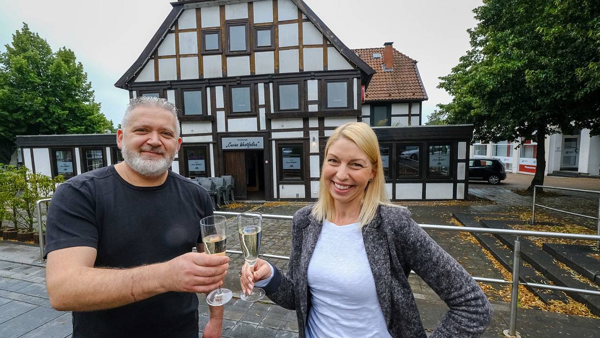 Ramona Schmidt und Antonio Ferlaino stoßen mit einem Gläschen Sekt auf ihr neues Restaurant an. | © Andreas Zobe/NW