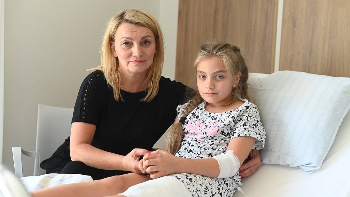 Nach den Bissen eines nicht angeleinten Hundes sitzt die zehnjährige Wiktoria mit dickem Verband am Oberschenkel im Krankenbett. Ihre Tante Danuta Kaiser hält ihre Hand und tröstet das Kind. Ein paar Tage muss das Mädchen noch im Krankenhaus bleiben. | © EvKB