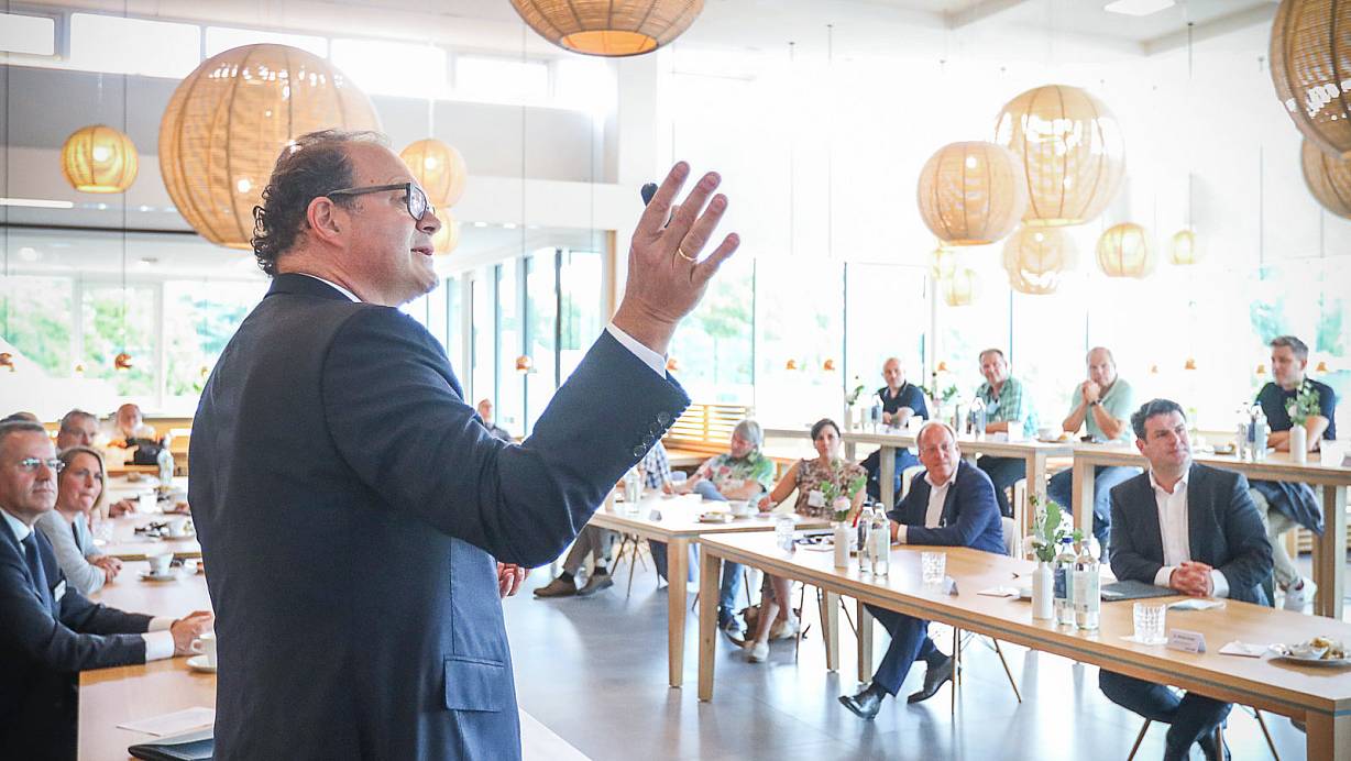Christian Thönes (DMG Mori) würdigt das Kurzarbeitergeld – Minister Hubertus Heil und Pit Clausen (v.r.) hören zu. | © Sarah Jonek