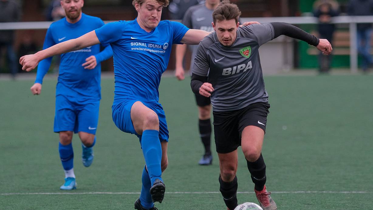 Kopf an Kopf: TuS Dornberg und TuS 08 Senne 1, hier Henrik Eckseler (l.) und Charin Huxohl im Laufduell in der Bezirksliga, wollen ins Pokalfinale. Dornberg spielt gegen VfB Fichte, Senne in Gadderbaum. Foto: Zobe | © Foto: Andreas Zobe/NW