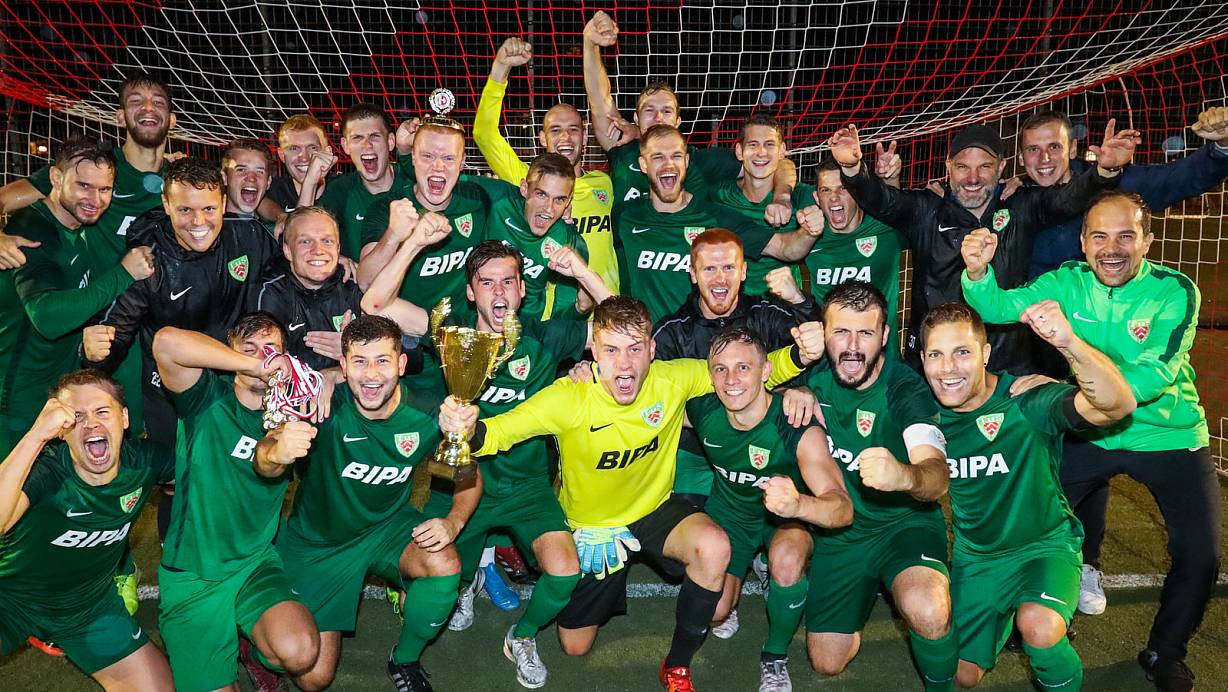 Im Feiern geübt: Die Mannschaft des TuS Dornberg freut sich ausschweifend über die geglückte Titelverteidigung im Kreispokal – welche ihr zugleich das „Mini-Triple“ bescherte. | © Sarah Jonek