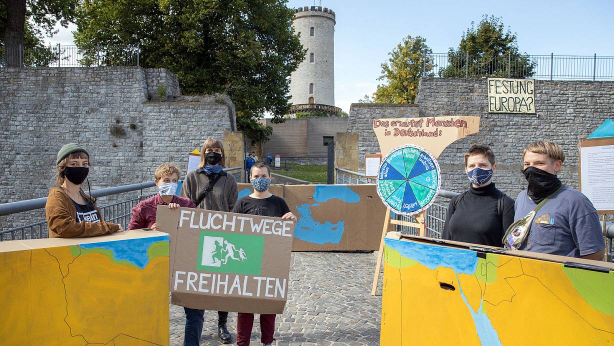 Aktivisten reagieren mit der Kunstaktion "Festung Europa?" am Übergang zur Sparrenburg auf das Niederbrennen Morias. | © Oliver Krato