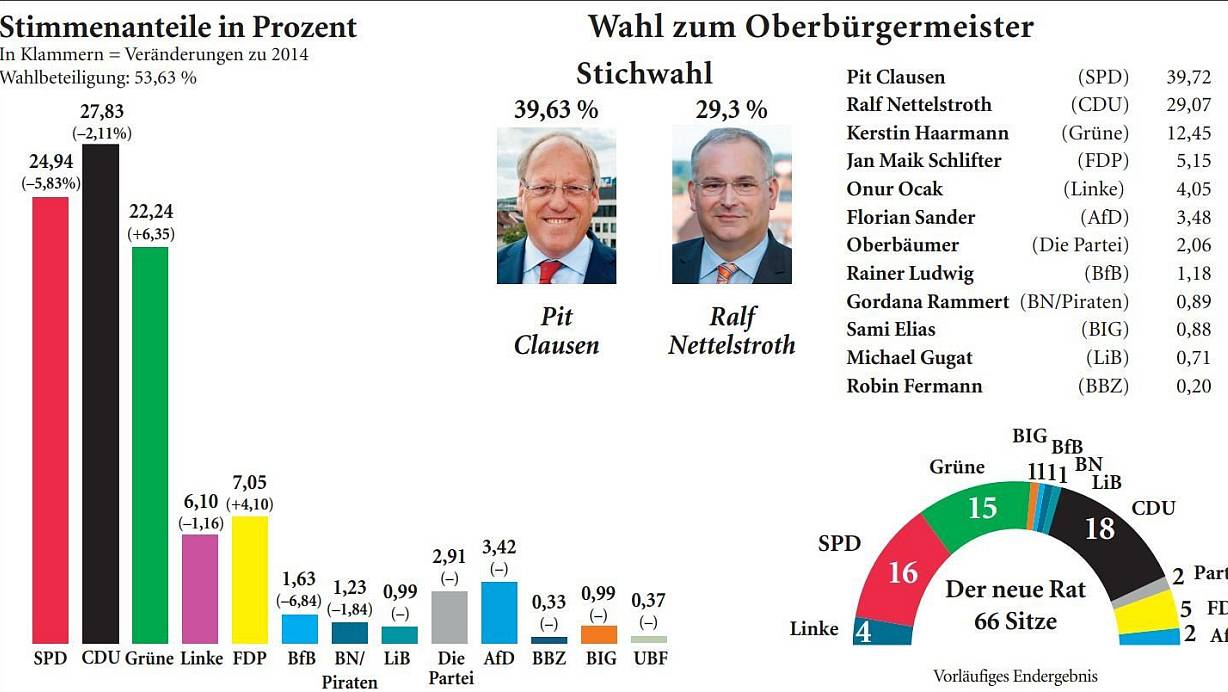 Bielefeld steuert auf eine spannende Stichwahl um das Oberbürgermeisteramt zu: Pit Clausen gegen Ralf Nettelstroth. Auch die FDP und die Grünen jubeln.