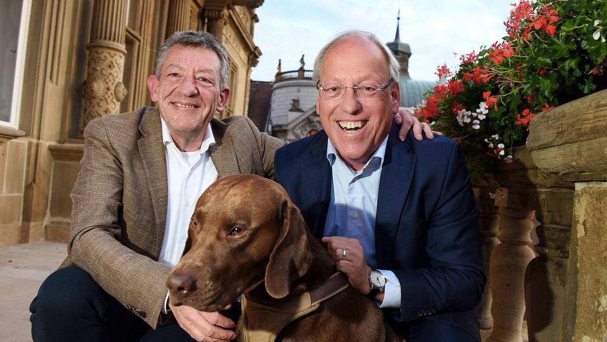 Wahlsieger  Pit Clausen freut sich auf dem Rathausbalkon mit Mann Thomas Sopp und Hund Scotty. | © Barbara Franke