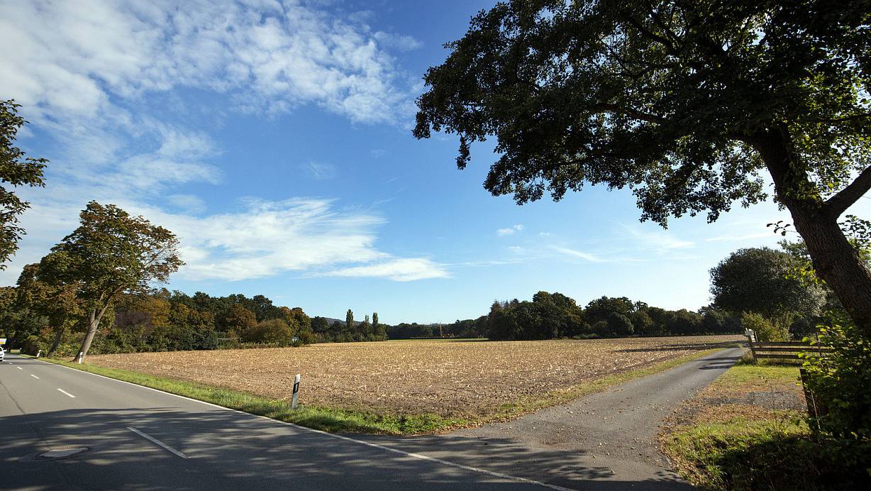 Den Maisacker zwischen dem Privatweg von rechts und den Privathaus hinter den Bäumen links an der Senner Straße sowie das hinten anschließenden Gelände Richtung Nordfeldweg inklusive der alten Hofstelle Steinkröger hat die BBVG für die Ansiedlung von Gewerbe gekauft. Dagegen regt sich Widerstand. | © Oliver Krato