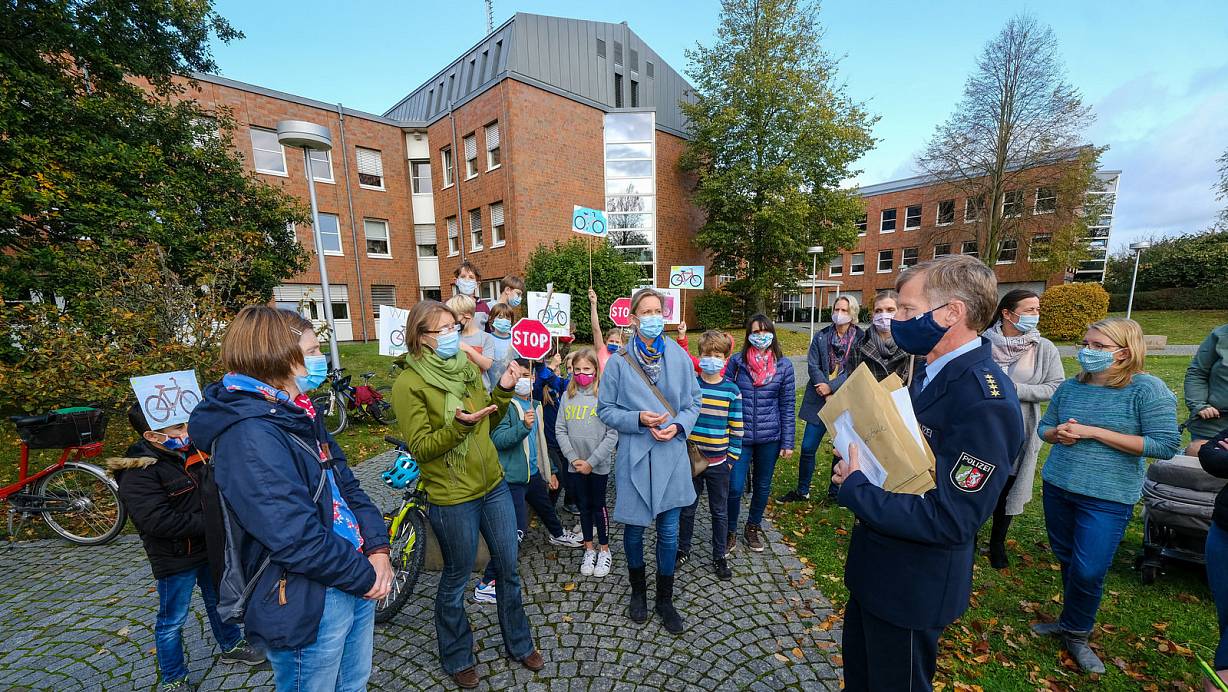 Kinder und Eltern protestieren für Verkehrserziehung und überreichen der Polizei mehr als 1.000 Unterschriften. Versprechen und eine Antwort der Beamten machen sie hellhörig.