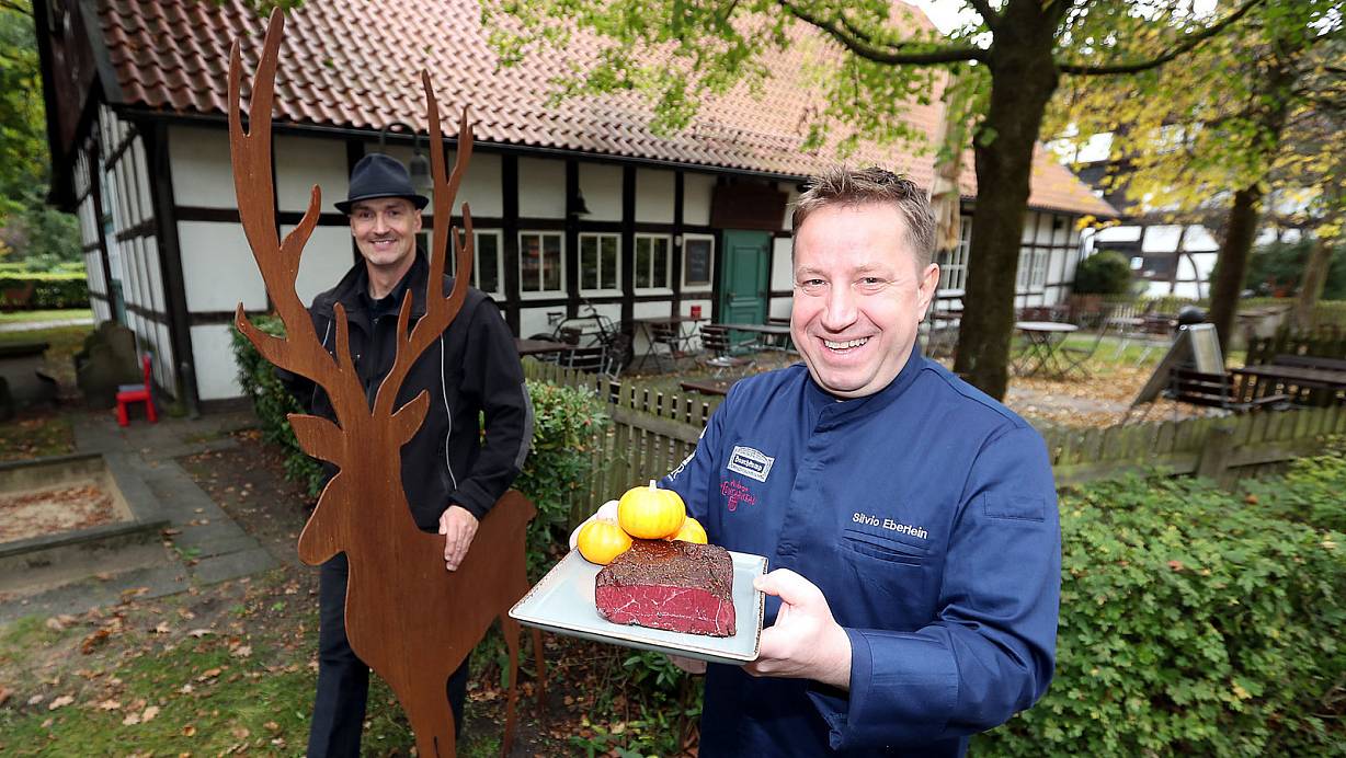 Kunst und Küche: Der Hirsch mit mächtigem Geweih wacht über den Historische Gasthof Buschkamp, in dem Gastronom Silvio Eberlein (rechts) auch Allerlei aus Wildtierfleisch zubereitet. Die Wildtierfiguren auf dem Hofgelände stammen vom Verler Stahlkünstler Hans Kordes. | © Wolfgang Rudolf