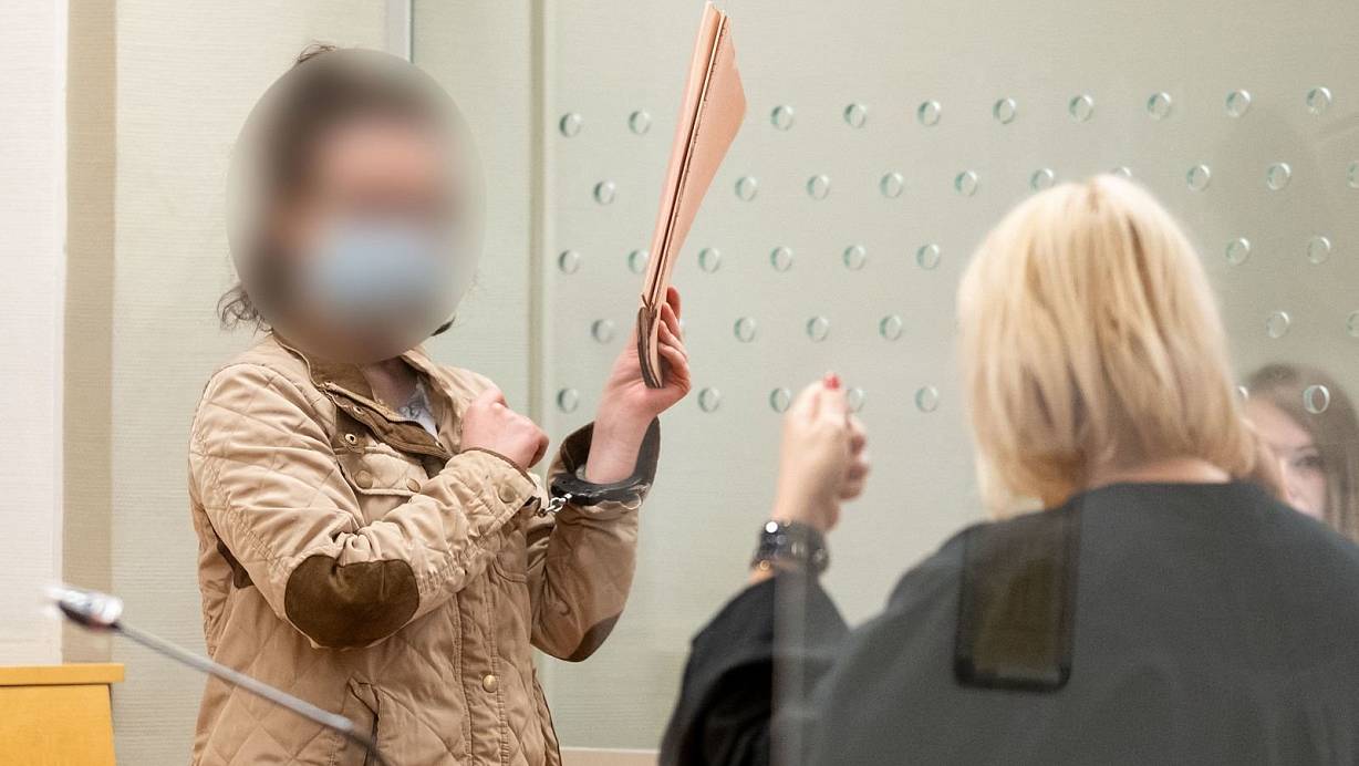 Die Angeklagte (25) steht im Saal des Landgerichts. Ihr wird heimtückischer Mord am Bielefelder Kadir A. vorgeworfen. | © picture alliance / dpa
