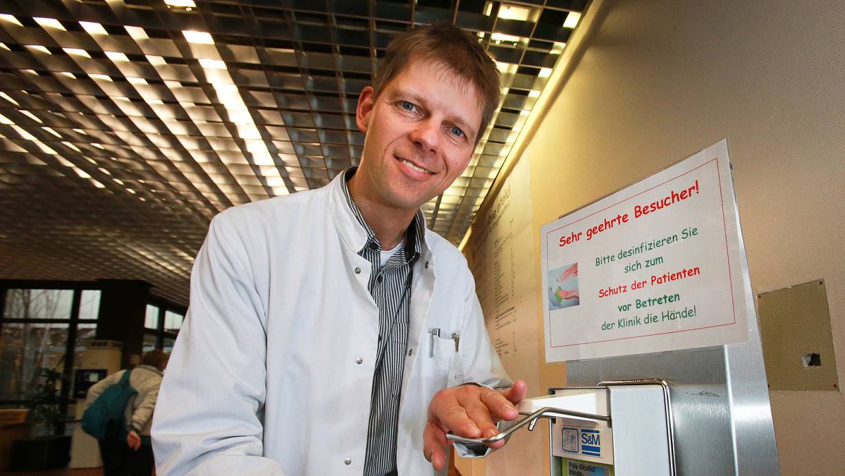 Hände desinfizieren: Krankenhaushygieniker Johannes Kleideiter steht im Eingangsbereich des Klinikums Bielefeld Mitte. | © Andreas Zobe