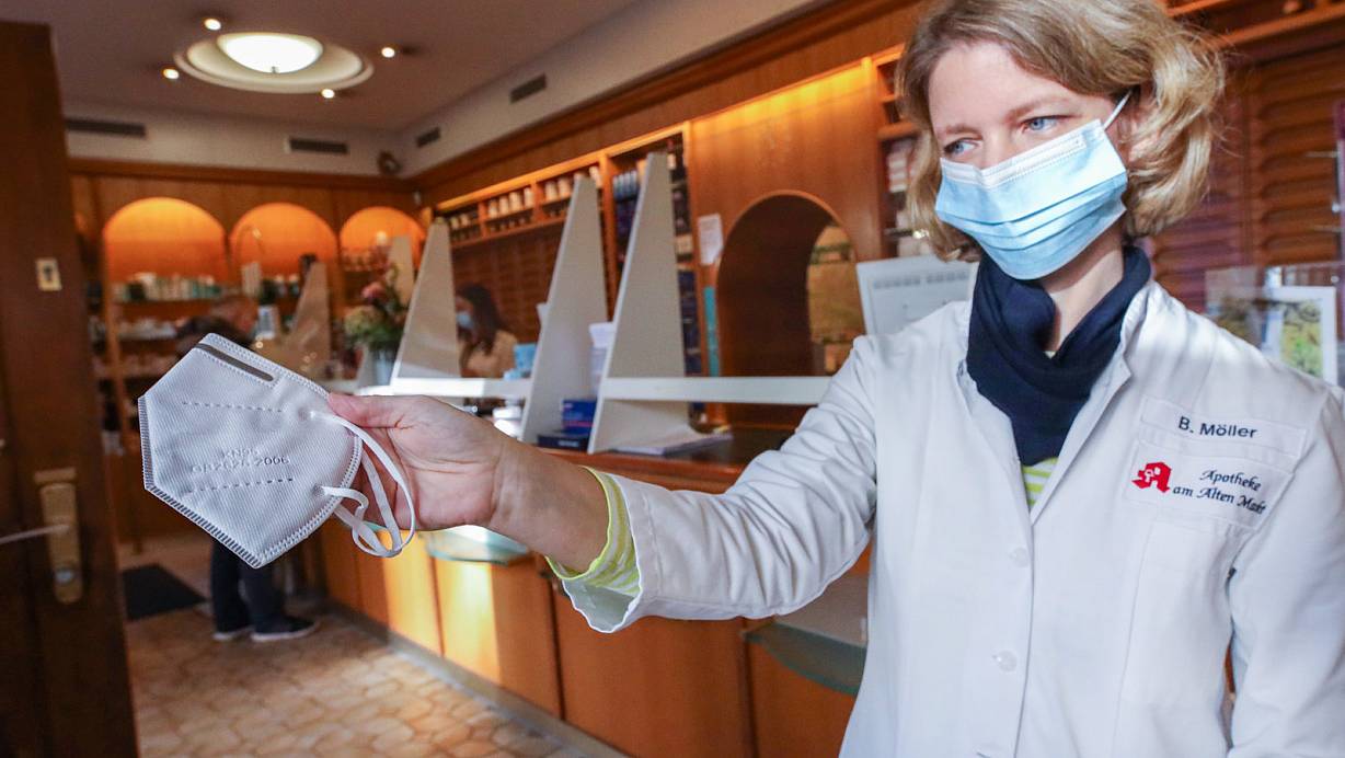 Auch in der Apotheke am Alten Markt fragen vermehrt Kunden nach FFP2-Masken. Apothekerin Bettina Möller zeigt eines der beiden Modelle, die ihre Apotheke führt. "Wir haben die Prüfnummern bei der Bundesanstalt für Arbeitsschutz und Arbeitsmedizin gecheckt, da gibt es keine Bedenken", sagt sie. | © Sarah Jonek