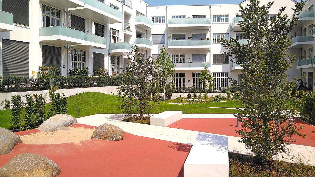 2017 haben die Sennestädter Architekten die Ankergärten auf dem Areal der ehemaligen Ankerwerke in auffällligem Rot-Grün-Kontrast in Szene gesetzt. | © L-A-E Ehrig GmbH