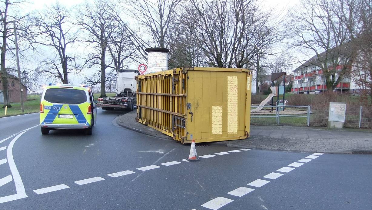 Hoch gefährlicher Vorfall in Bielefeld Altenhagen: Der Wechselcontainer löst sich vom Lkw-Fahrgestell, rutscht herunter und knallt gegen eine Litfaßsäule.